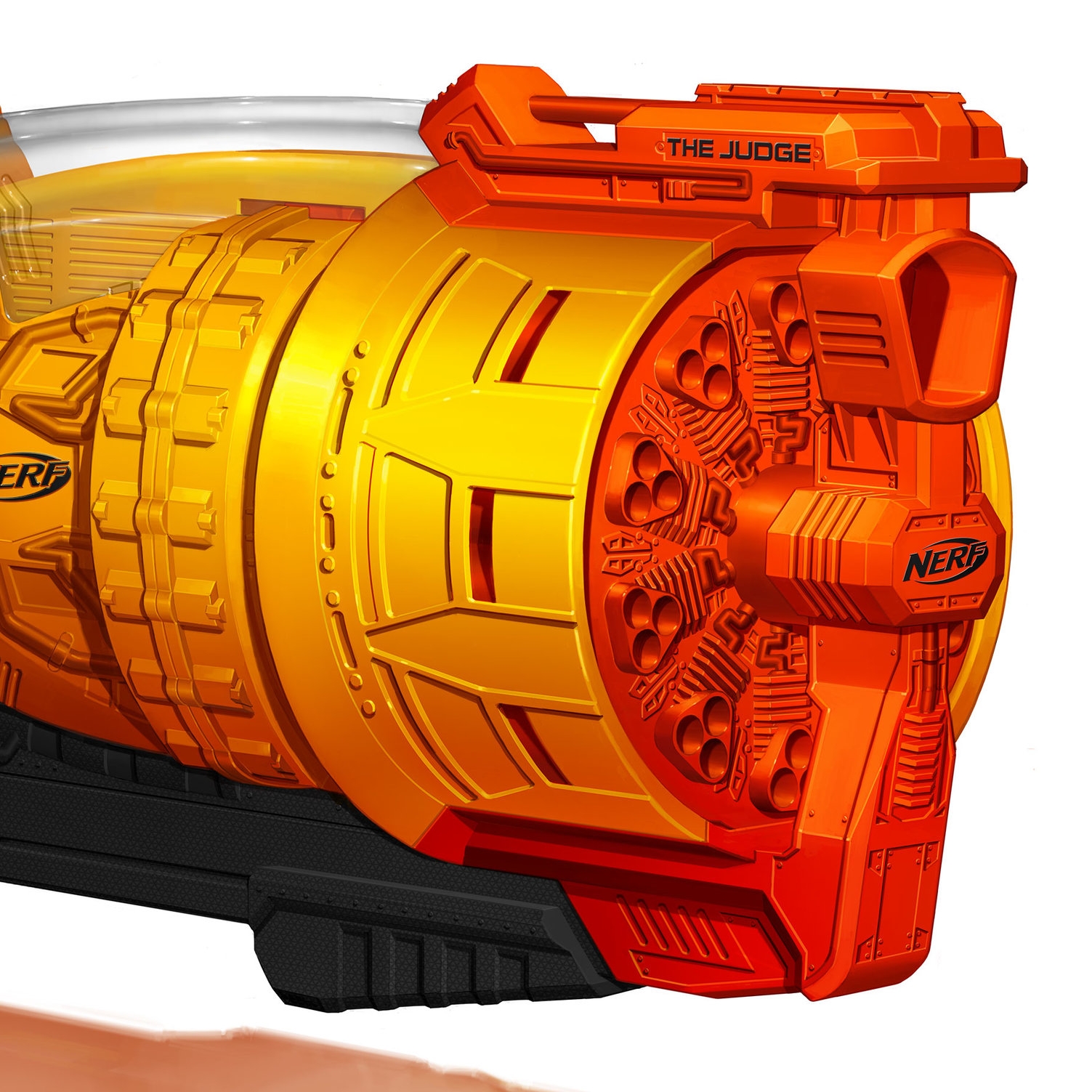 The Judge is the second Doomlands 2169 blaster I designed as part of the 2017 line (available in stores in the Fall). It is meant to continue the aesthetics of the Doomlands brand, and is the eighth blaster in the overall series.