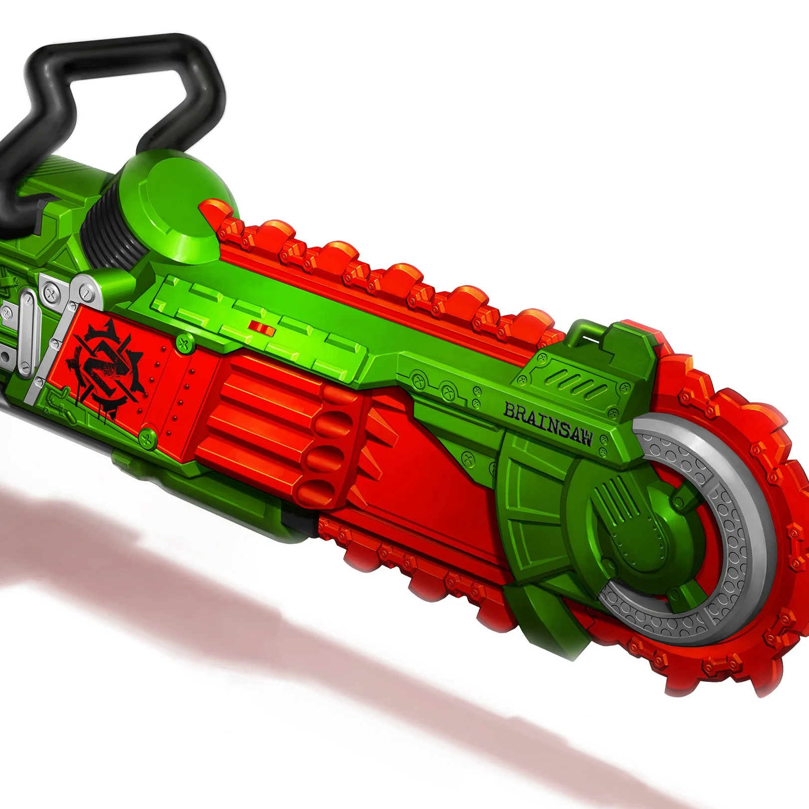 The Brainsaw is the second blaster in the Zombie Strike line that I designed, featuring a pump-action handle and a pull trigger that revs the front circular blade. The blaster also features two banks of four-dart barrels (each on opposite sides of the main blade).