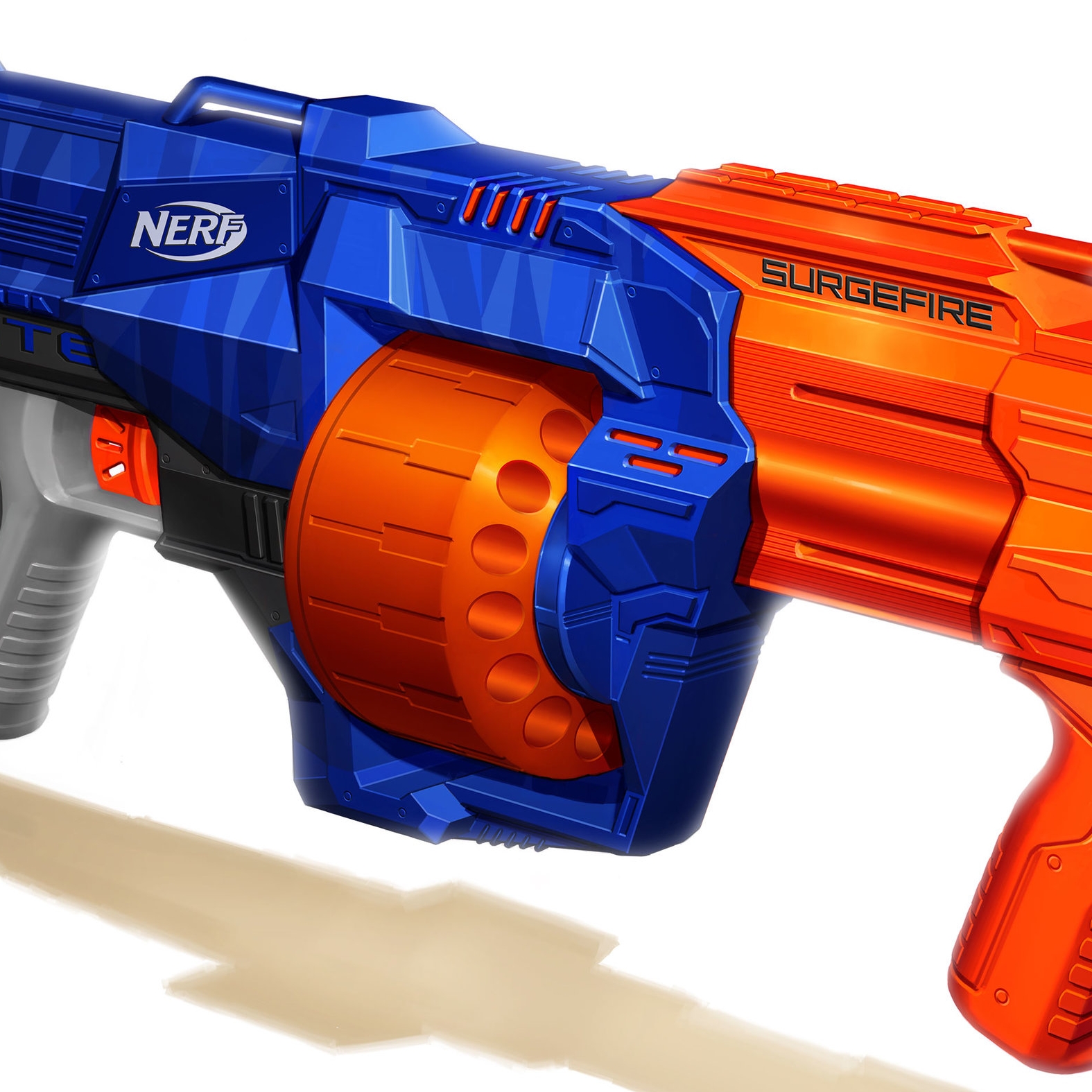 The N-Strike Elite Surgefire is the first blaster in the Elite line that I designed. It has a fifteen-dart capacity, held in a rotating drum that is primed by using the forward handle.